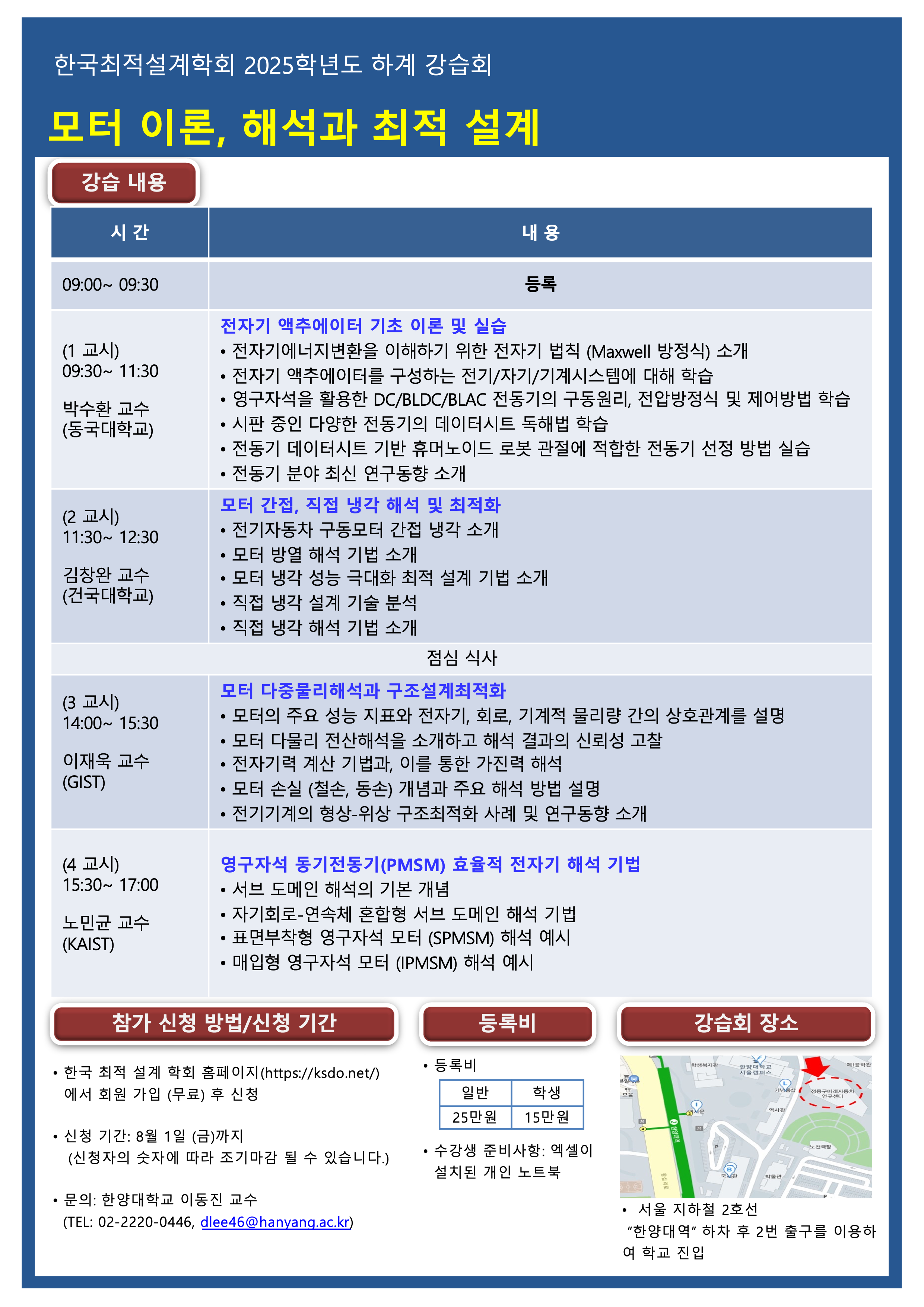본 강습회에서는 전자기 에너지 변환 기초 이론부터 시작하여 전기기계 시스템(모터 등)의 최신 해석 및 설계 기법을 강의와 실습을 통해 익힙니다. 전자기 액추에이터의 기초부터 전동기 구동원리, 모터 간접 및 직접 냉각 해석, 다중물리 연계 해석까지 폭넓게 다루며, 실무 적용 사례를 중심으로 진행됩니다. 또한 고효율 동기전동기 설계 개념 및 실제 사례 분석을 통해 현업 에너지어의 설계 역량 강화를 목표로 합니다. 좀 더 자세한 사항은 아래 첨부 파일을 참조 바랍니다. (문의: 총무이사 이동진, 02-2220-0446, dlee46@hanyang.ac.kr)
